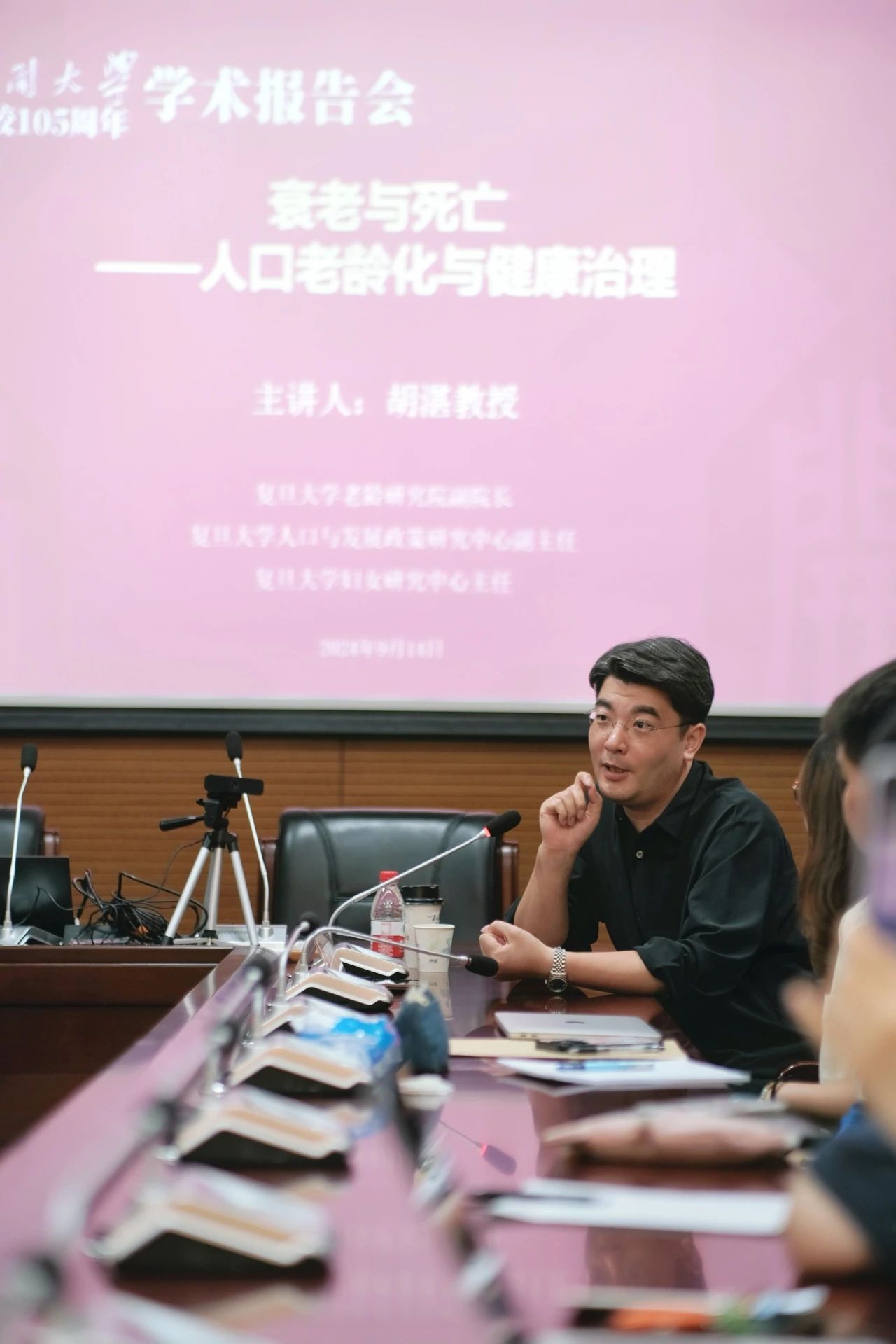 建校105周年学术报告会”系列讲座。本次讲座特邀复旦大学老龄研究院副院长、人口与发展政策研究中心副主任、妇女研究中心主任胡湛教授,开展“衰老与死亡——人口老龄化与健康治理”的学术报告。讲座由污漫