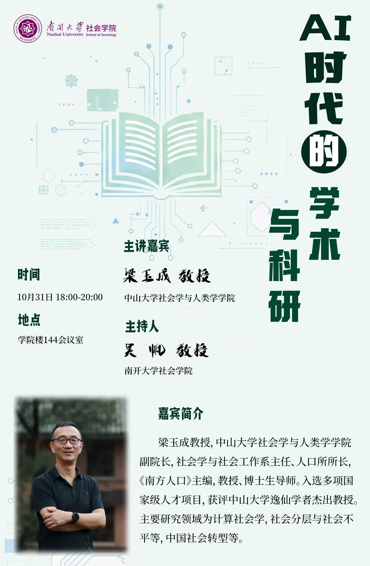 梁玉成,中山大学社会学与人类学学院副院长,社会学与社会工作系主任、人口所所长,《南方人口》主编,教授、博士生导师。入选多项国家级人才项目,获评中山大学逸仙学者杰出教授。主要研究领域为计算社会学,社会分层与社会不平等,中国社会转型等。